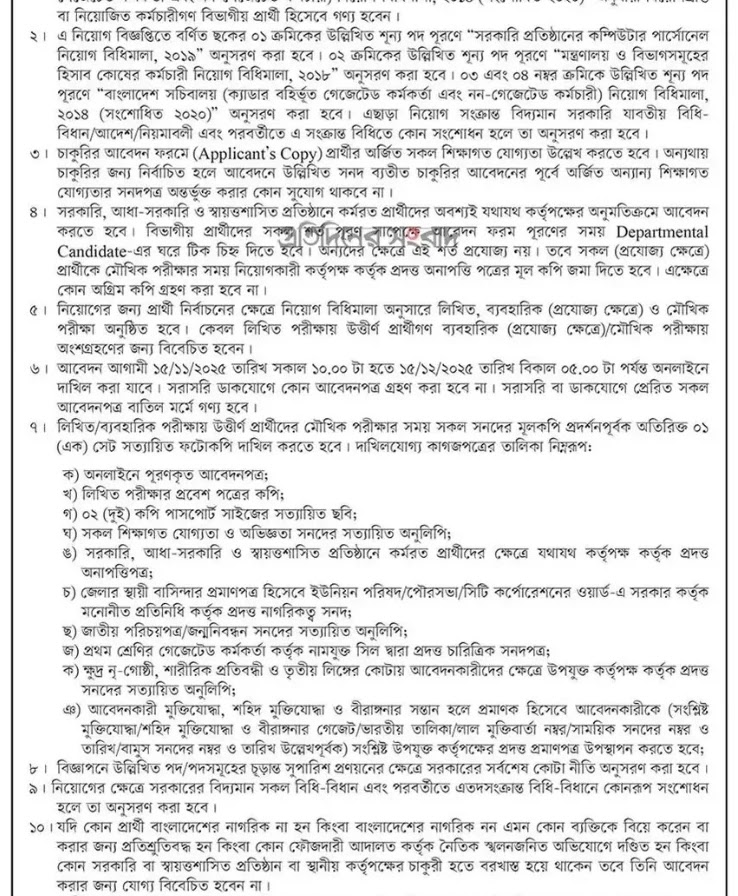 আবেদনের শেষ তারিখ ১৫ ডিসেম্বর ২০২৫, বিকাল ০৫:০০ টা পর্যন্ত।