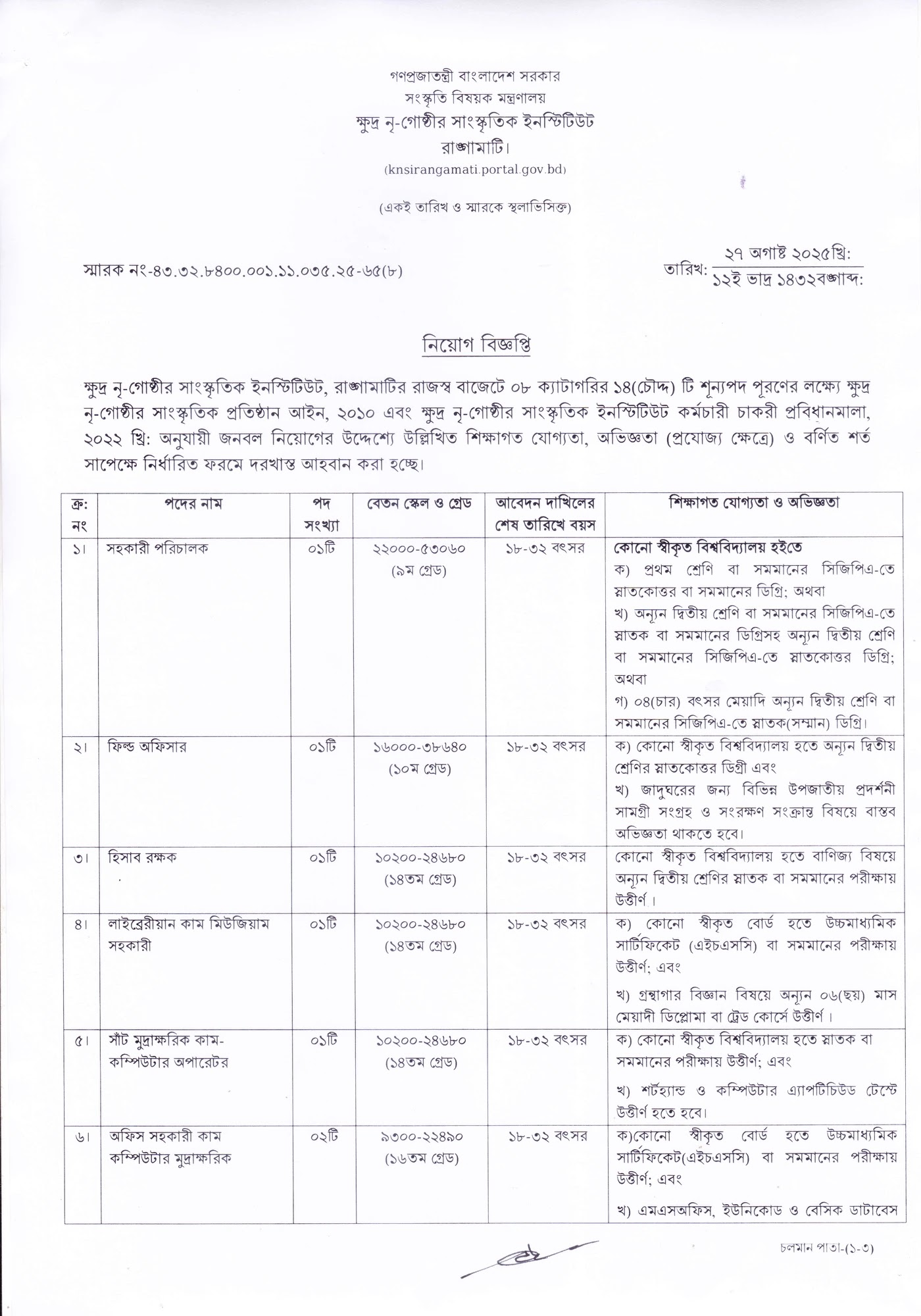 ক্ষুদ্র নৃ-গোষ্ঠীর সাংস্কৃতিক ইনস্টিটিউট রাঙ্গামাটি নিয়োগ বিজ্ঞপ্তি ২০২৫