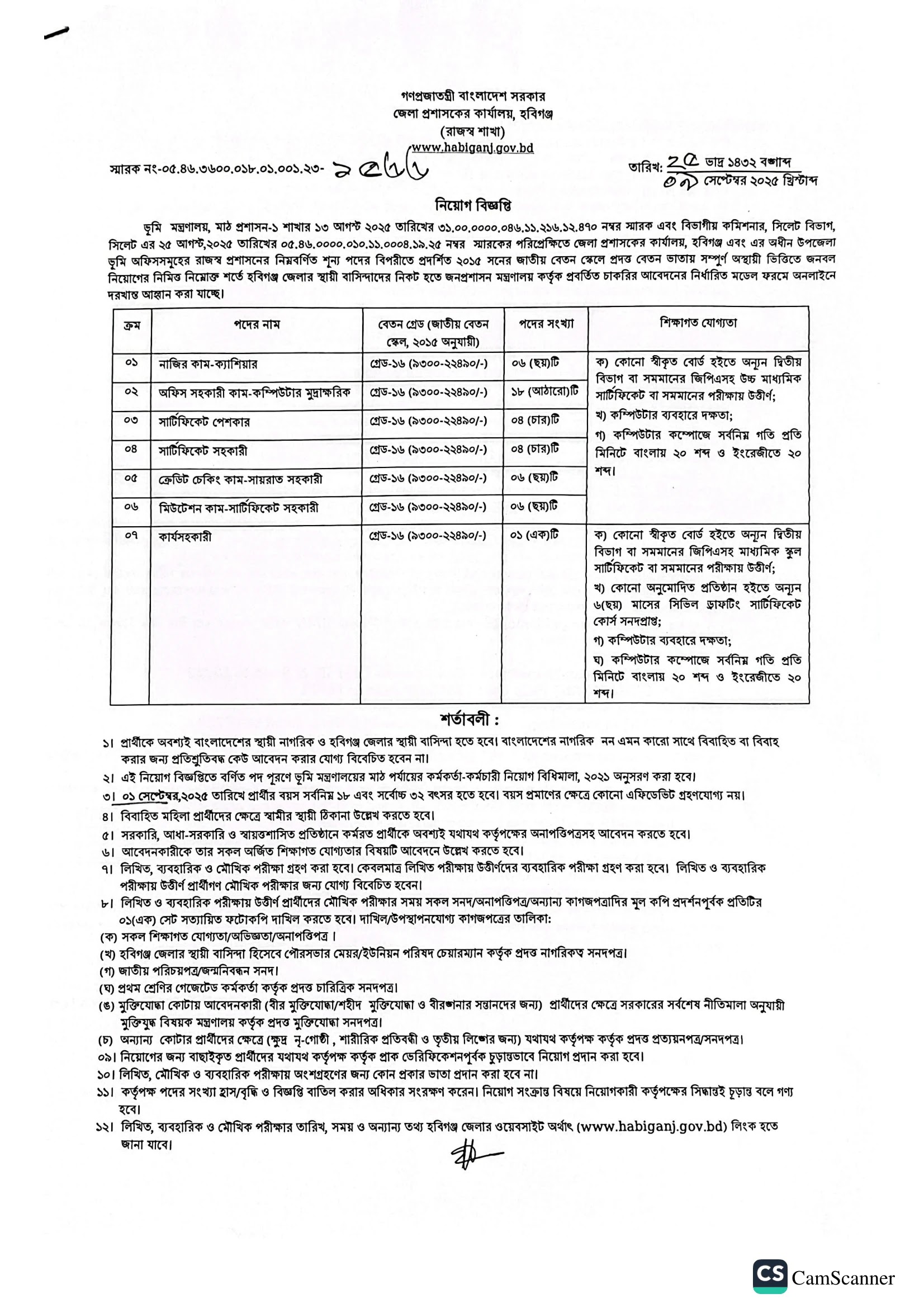 হবিগঞ্জ জেলা প্রশাসকের কার্যালয় নিয়োগ বিজ্ঞপ্তি ২০২৫