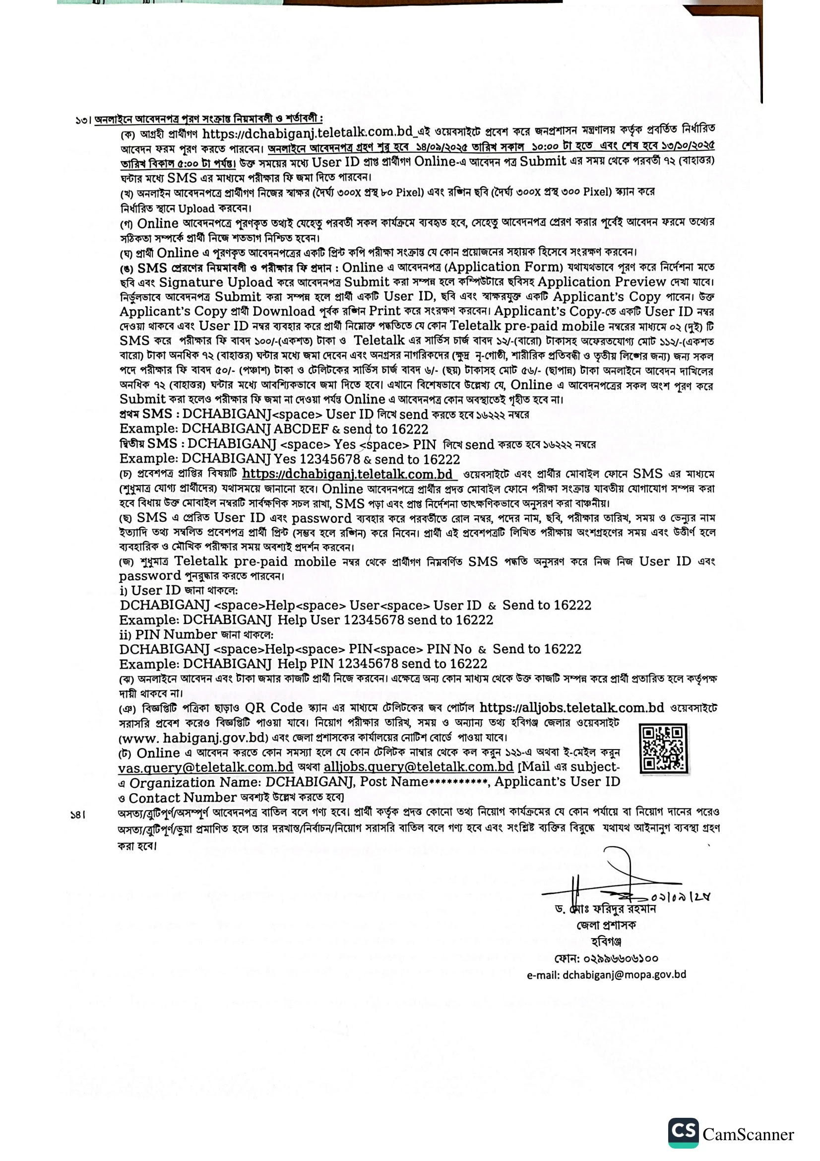 | আবেদন করার মাধ্যমঃ | http://dchabiganj.teletalk.com.bd/ |