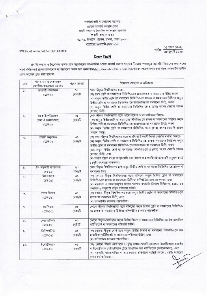 WEWB Job Circular 2025 আবেদন পদ্ধতি: অনলাইনেওয়েবসাইট: https://wewb.teletalk.com.bd আবেদন সংক্রান্ত তথ্য আবেদন ফি (পদ অনুযায়ী): পদ ফি SMS চার্জ মোট