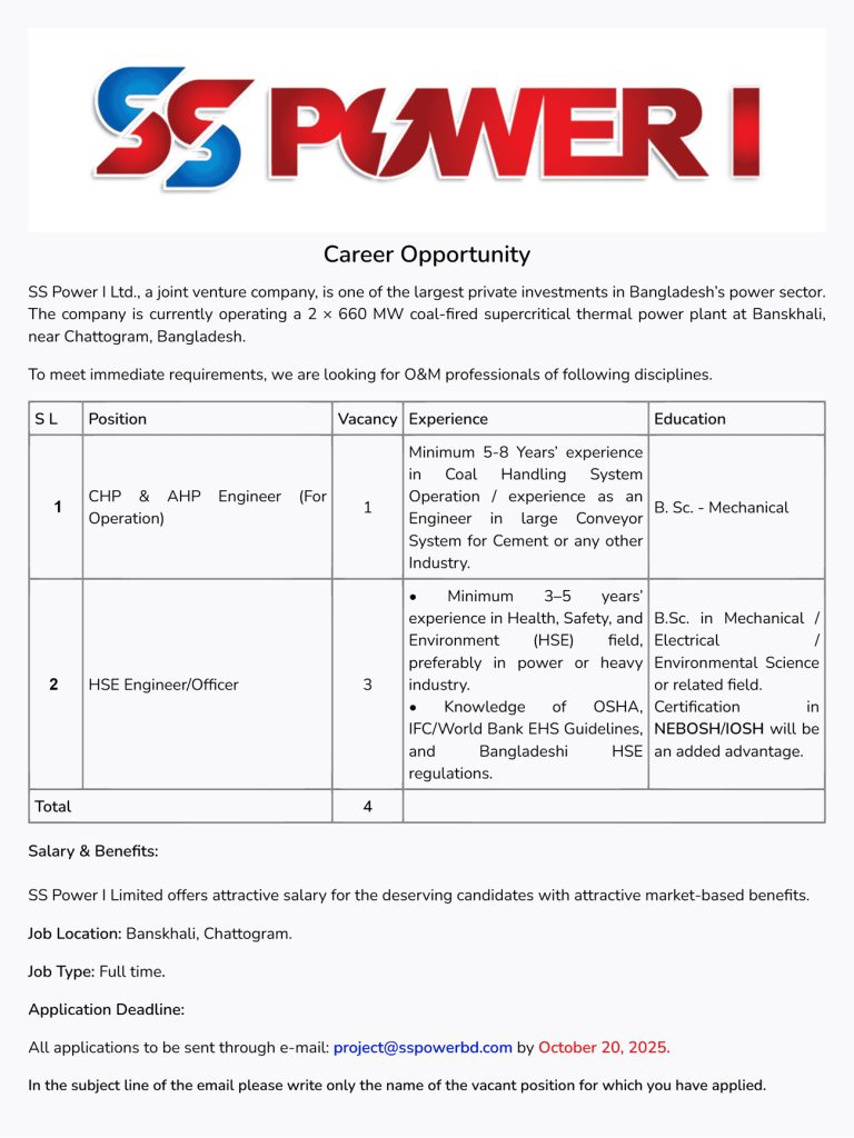 SS Power I Limited Job Circular 2025 SS Power I Limited job circular 2025 has been published by SS Power