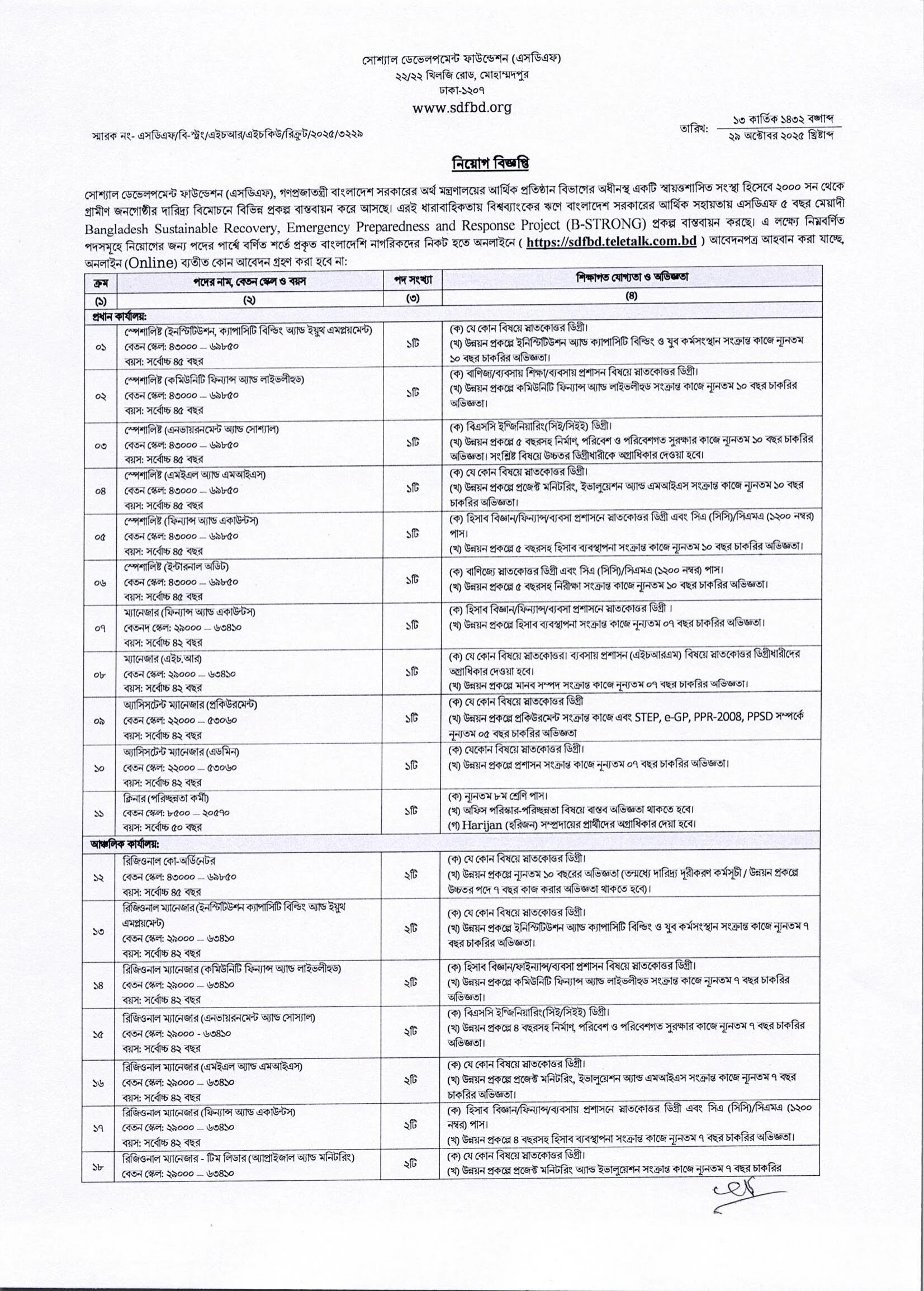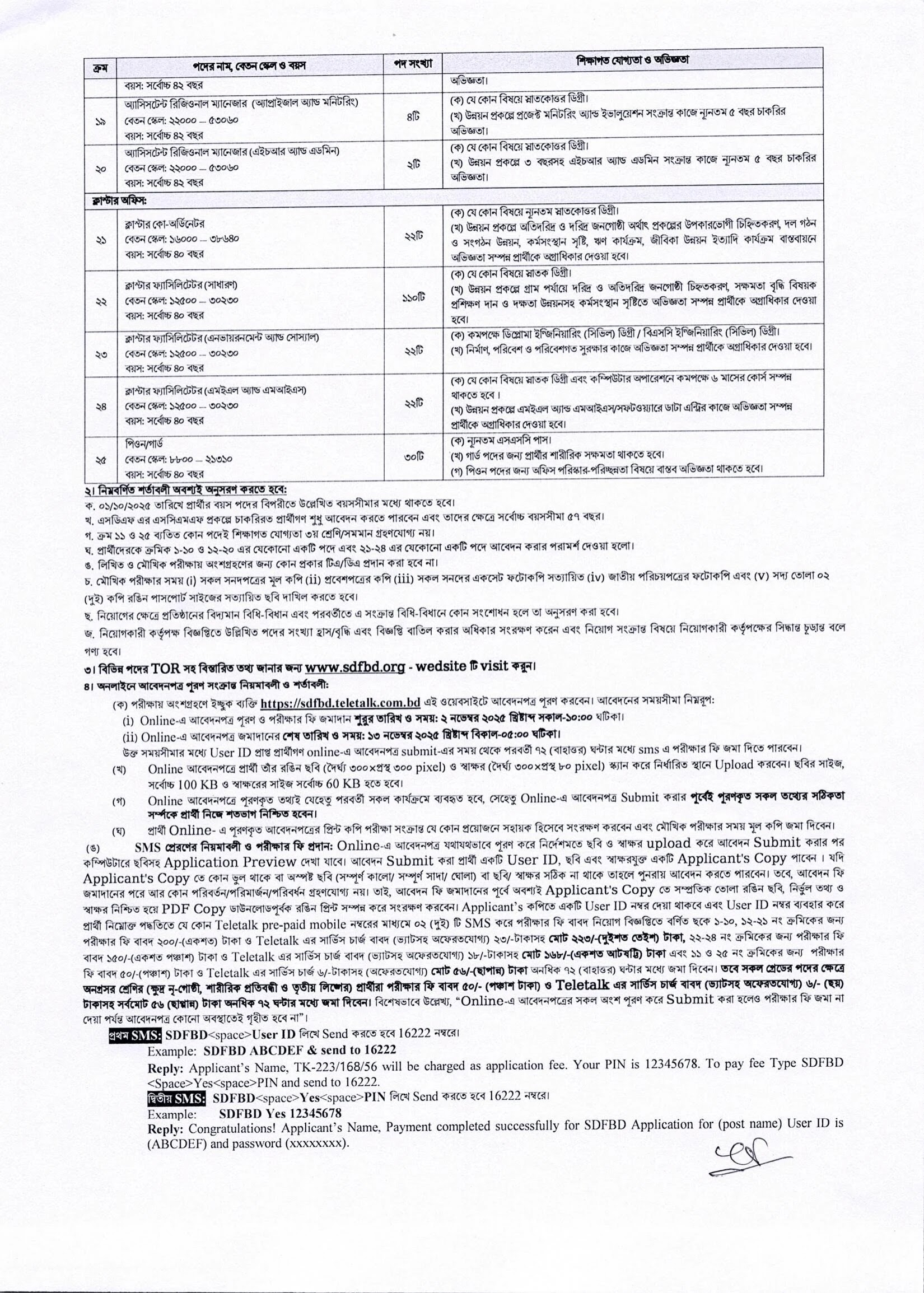 প্রতিটি পদের জন্য নির্দিষ্ট শিক্ষাগত যোগ্যতা, অভিজ্ঞতা ও দক্ষতা প্রয়োজন।🔹 বিস্তারিত তথ্য পাওয়া যাবে www.sdfbd.org ও sdfbd.teletalk.com.bd-তে।