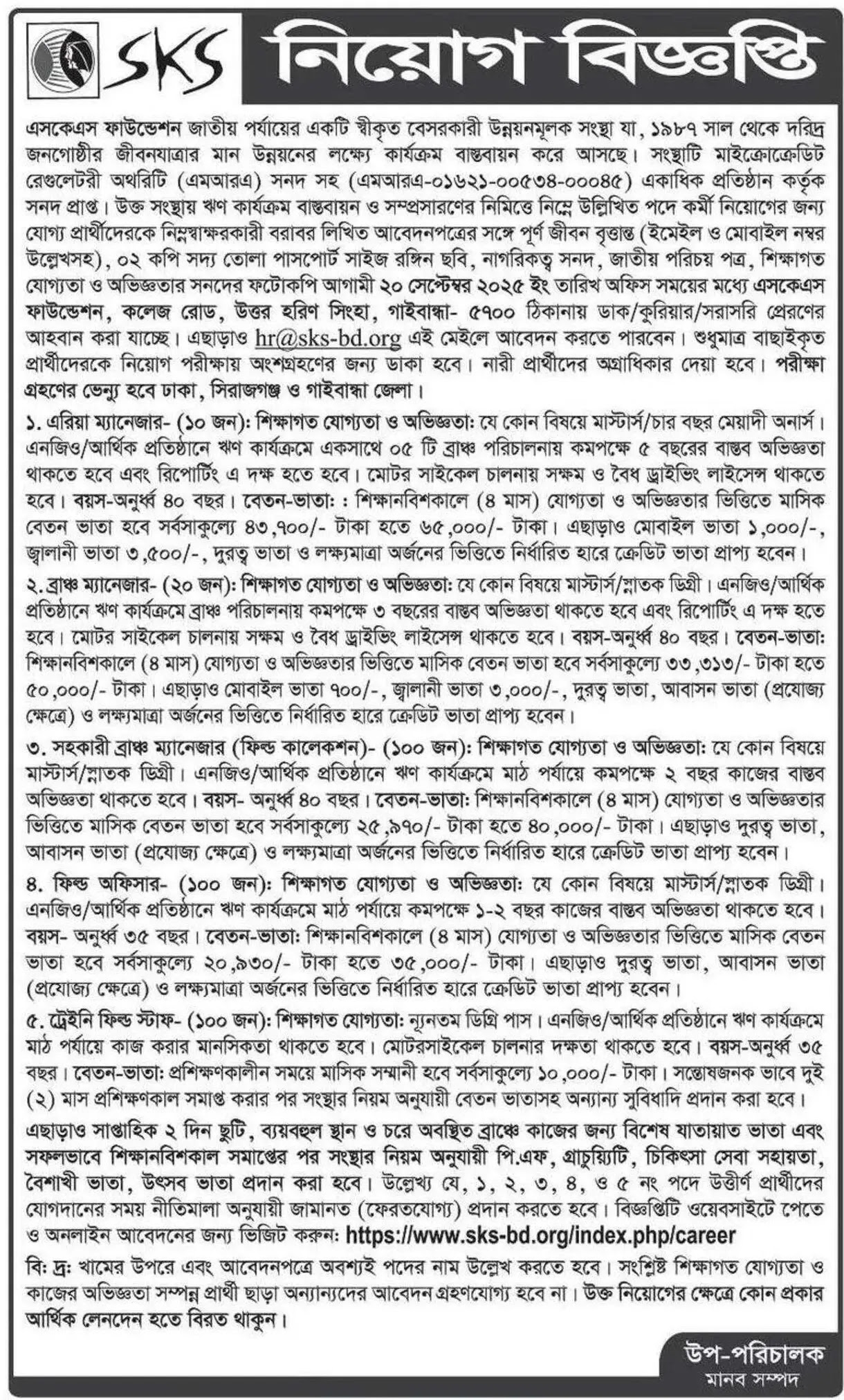 এসকেএস ফাউন্ডেশন নিয়োগ ২০২৫ এ শুধুমাত্র বাংলাদেশী ১৮ (আঠারো) বৎসরের ঊর্ধ্বে নারী ও পুরুষ (Female & Male) শিক্ষাগত যোগ্যতা ও পদের অজ্ঞিতা অনুযায়ী আবেদন করতে পারবে।